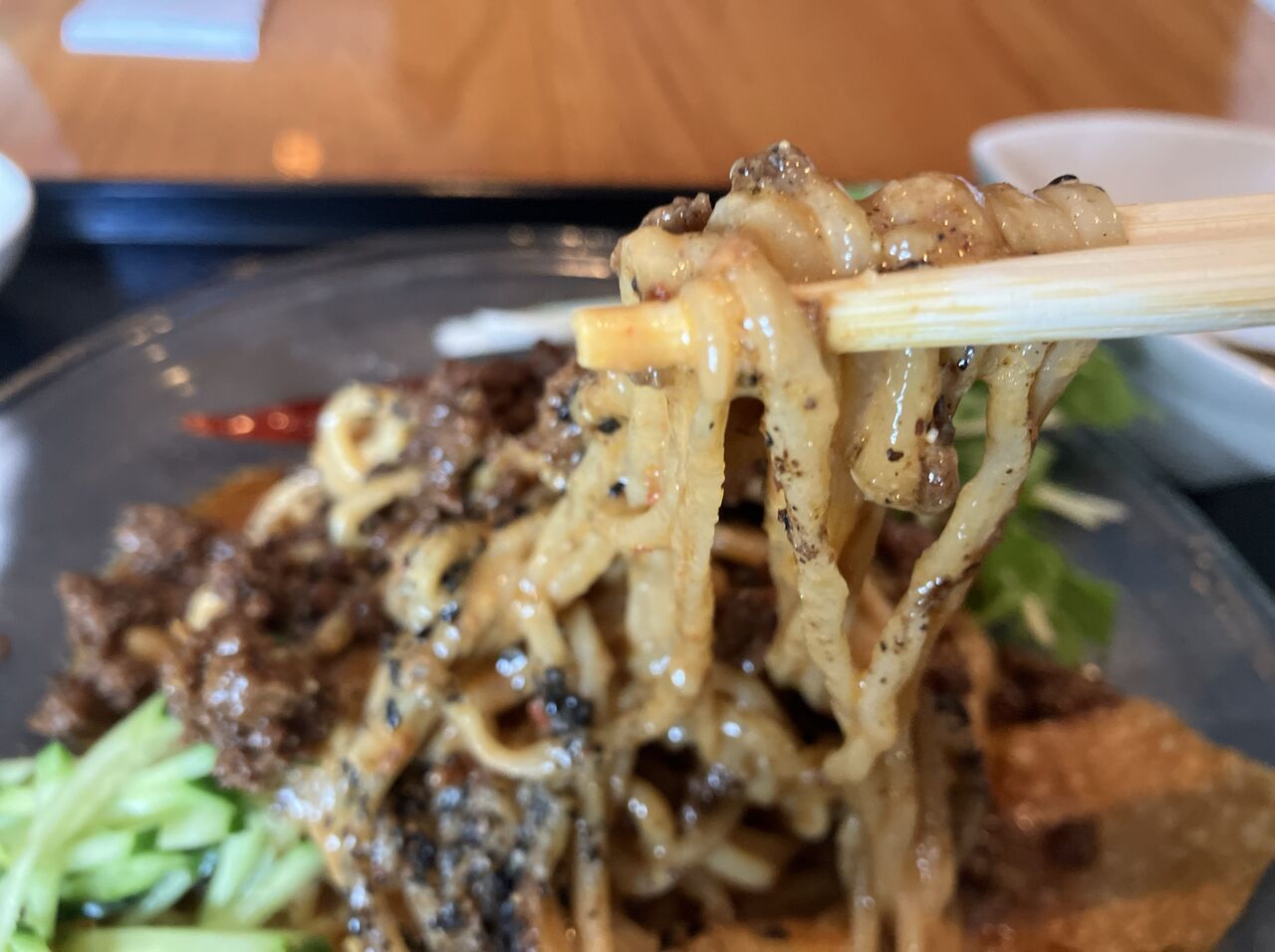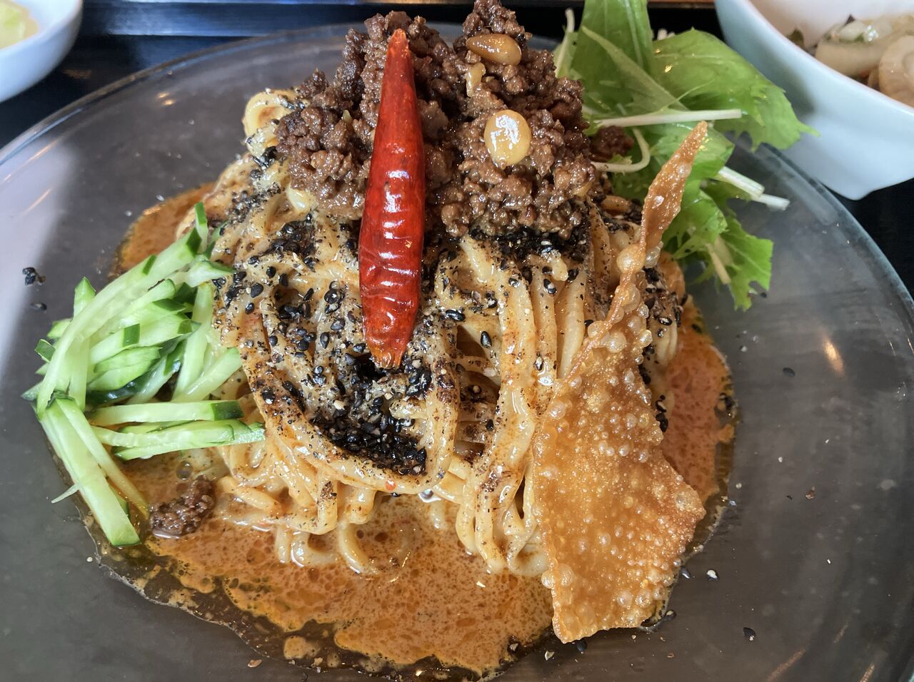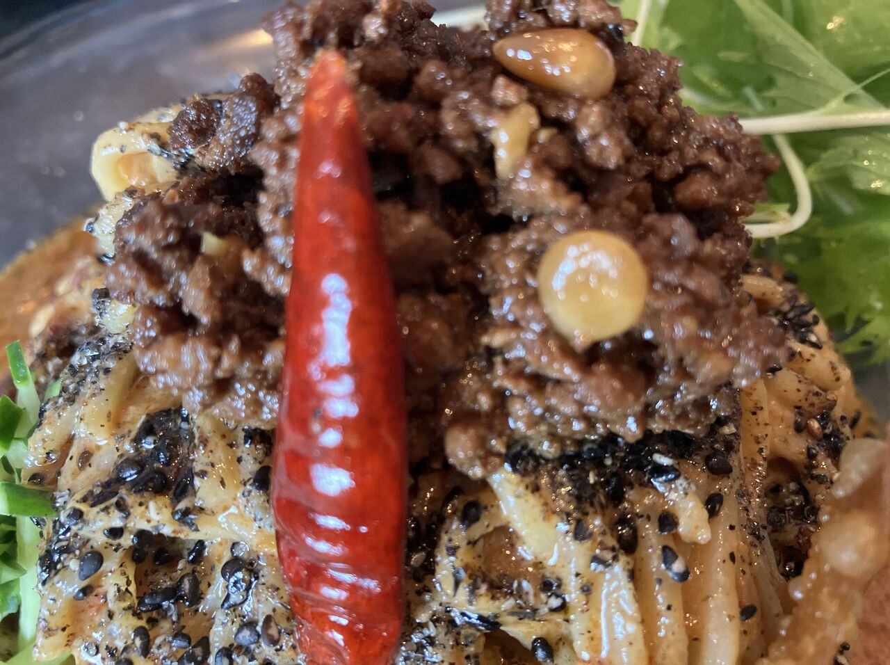 こんもりと盛り付けられた麺の上にたっぷりの肉味噌と黒胡麻。