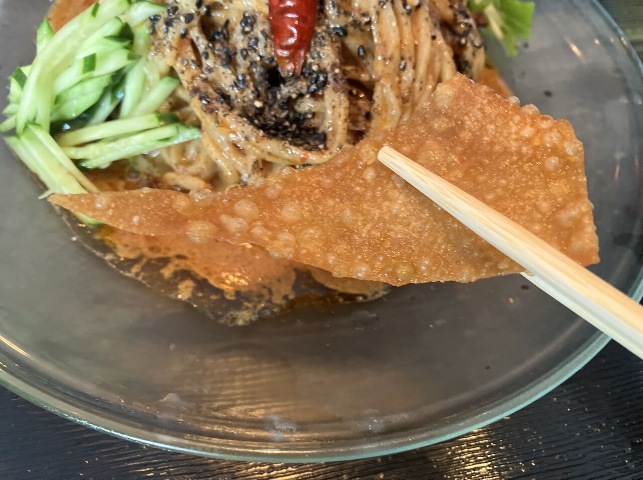 脇にはきゅうり、水菜、揚げたわんたんの皮。