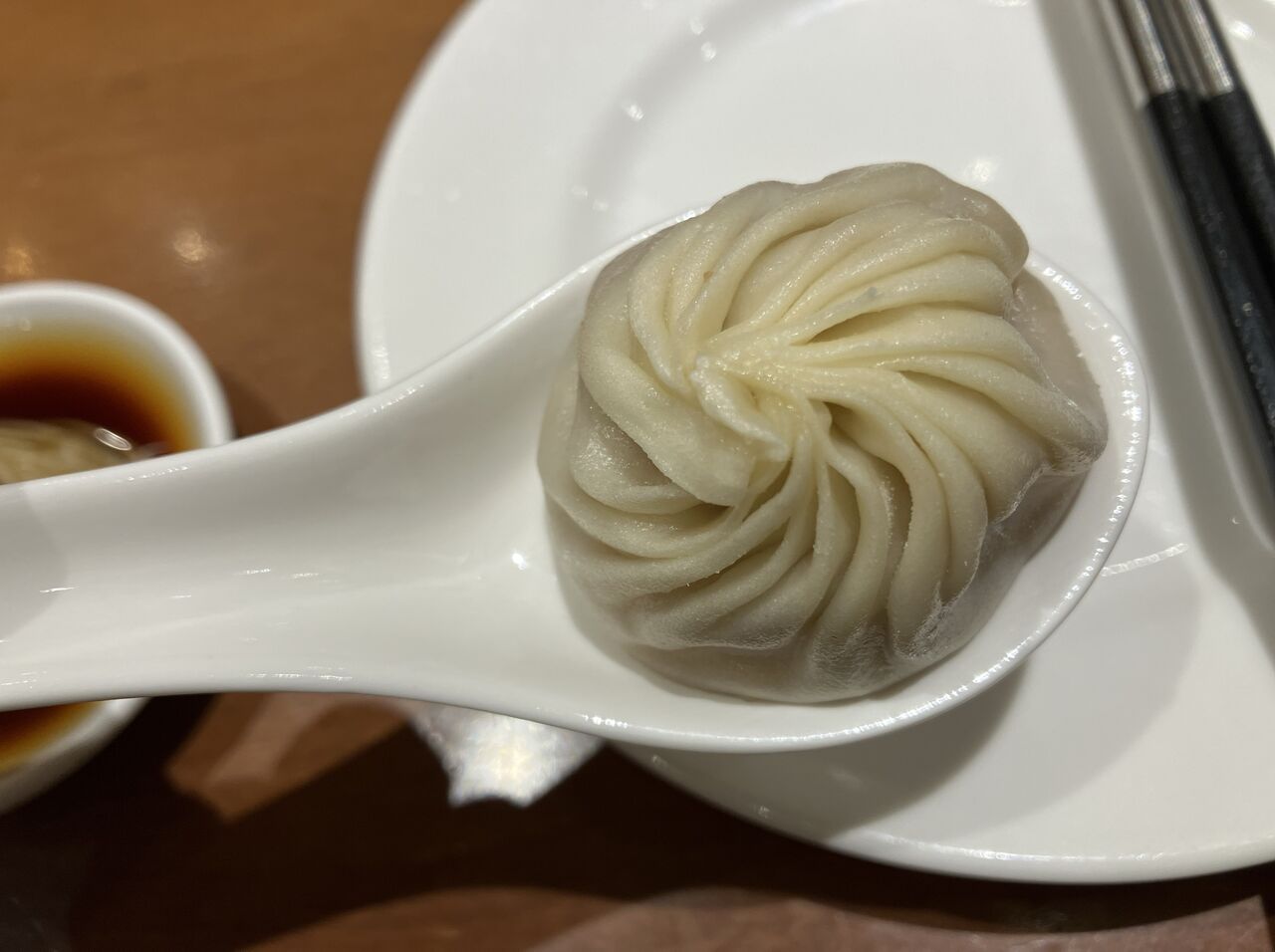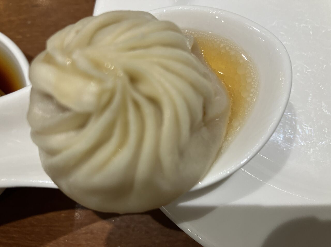 レンゲに乗せ皮を破くも、以前はジュワーと肉汁が出てきたが、今回は30秒以上待ってようやく肉汁で満たされる。