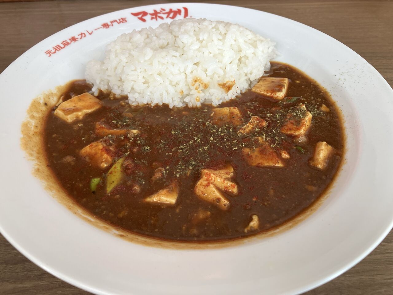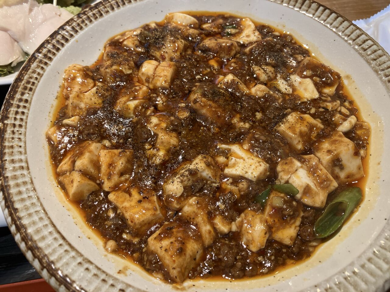 麻婆豆腐は濃い茶褐色で美味しそうな見た目。