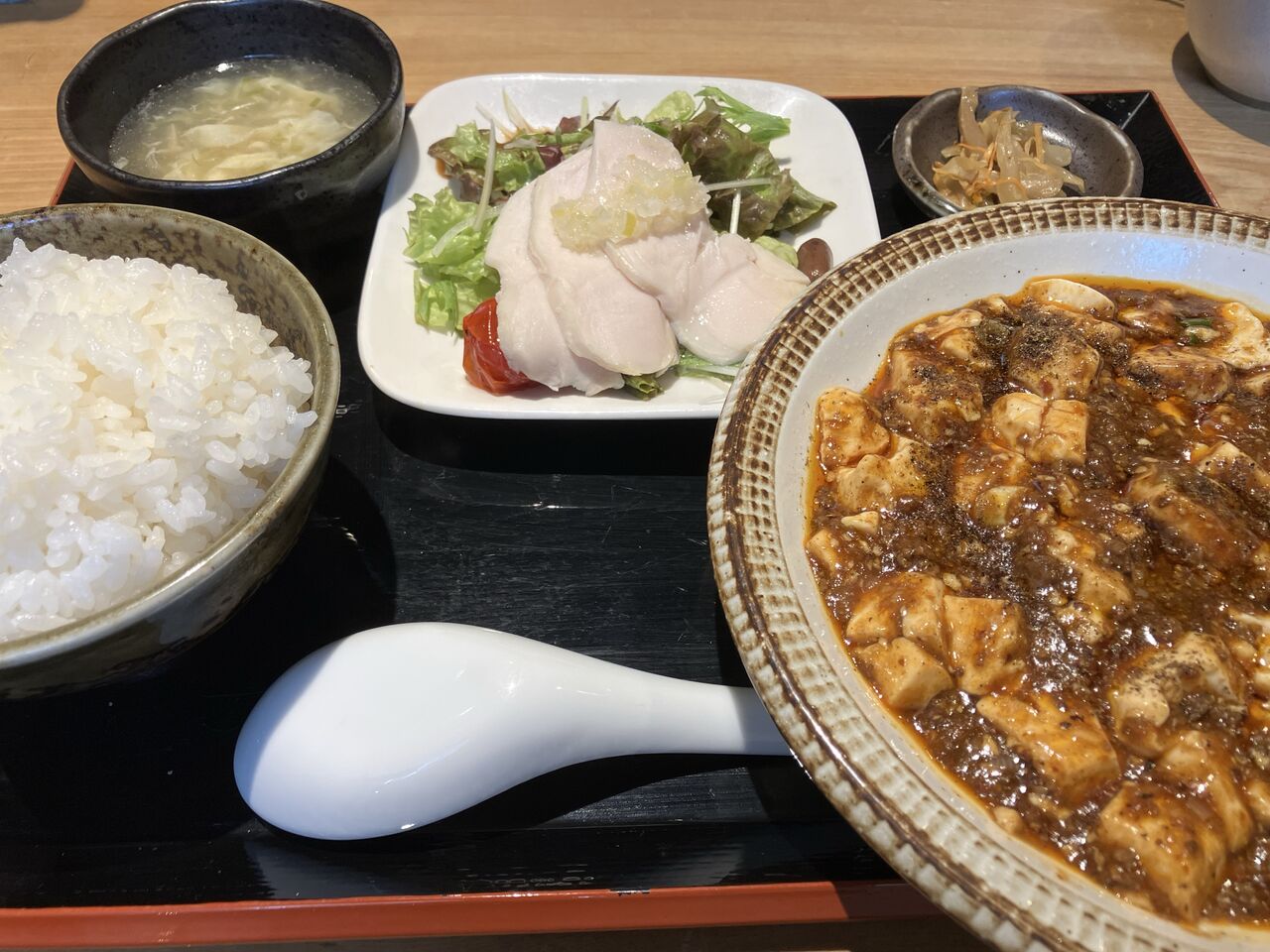 お盆に麻婆豆腐、蒸し鶏、ご飯、スープ、搾菜でなかなかのボリューム。