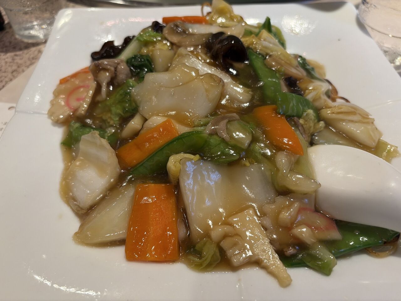 四角い大きめの皿にたっぷりの餡掛け焼きそば。