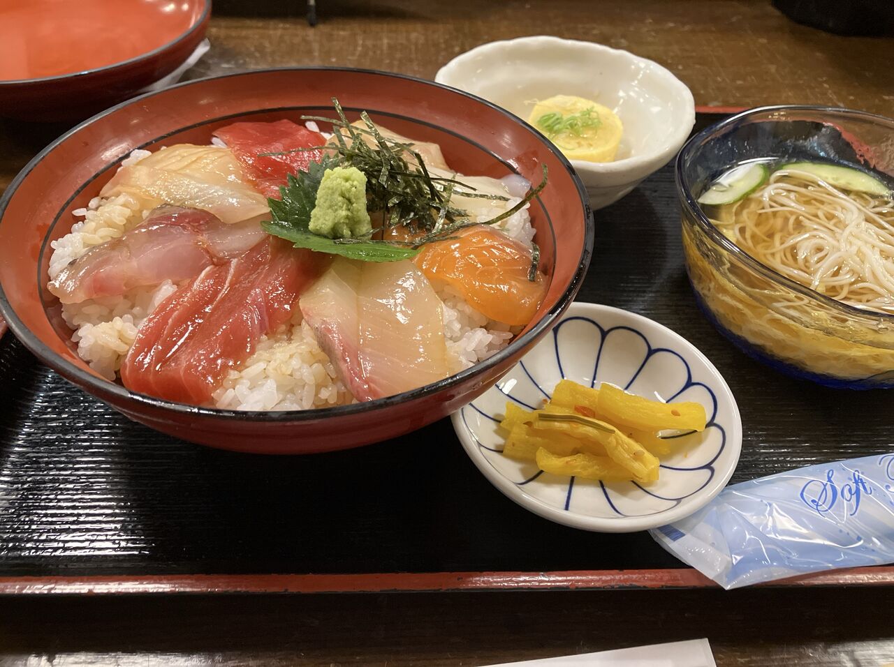 海鮮丼に小鉢(卵焼きの餡掛け)、漬物、そして味噌汁の代わりにキンキンに冷えたそうめん。