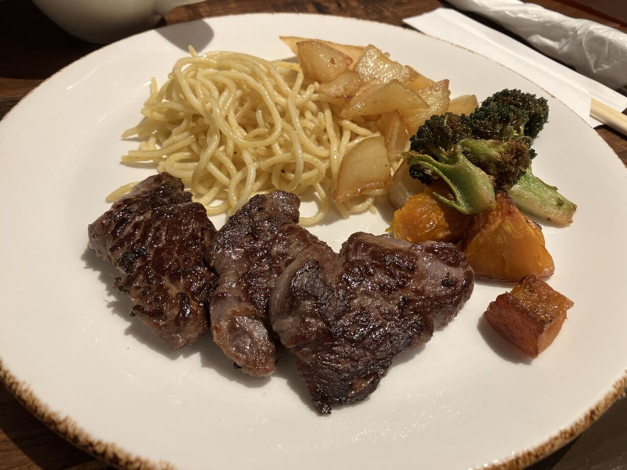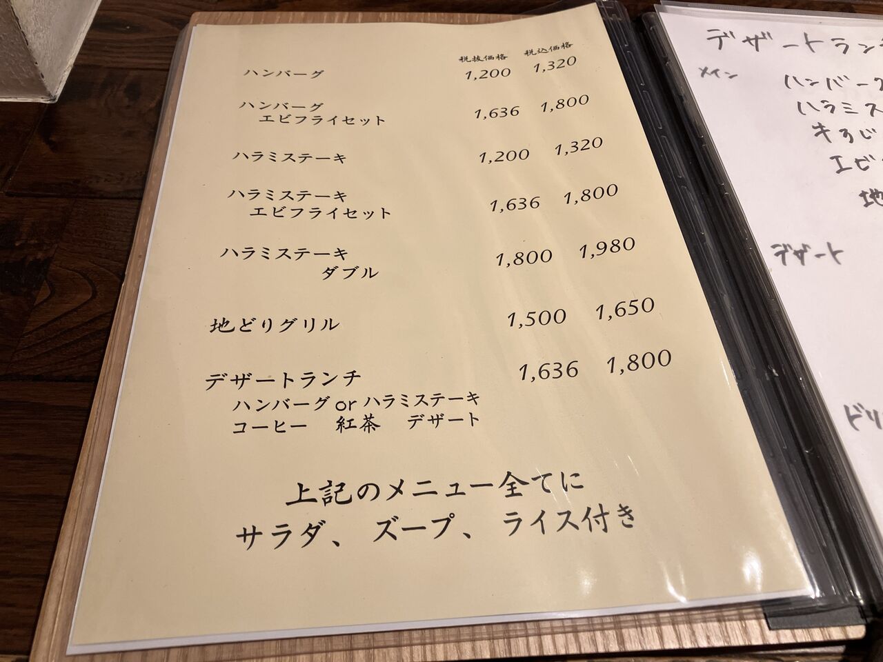 店頭メニューだとハンバーグ、ベーコン添えステーキ、トンカツなど。