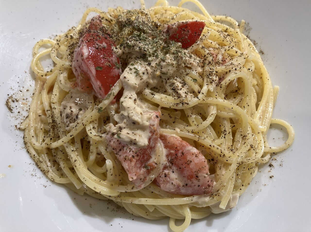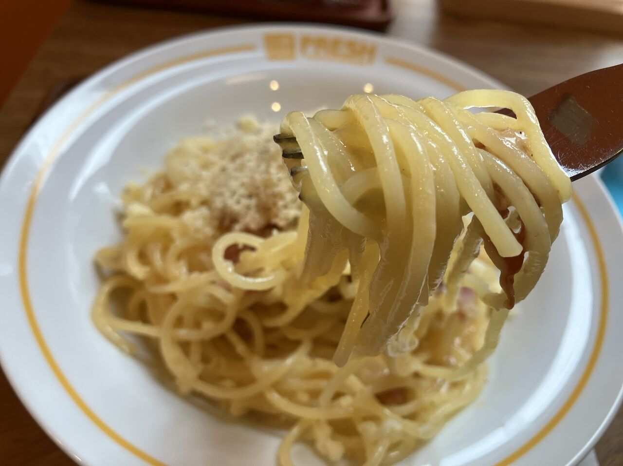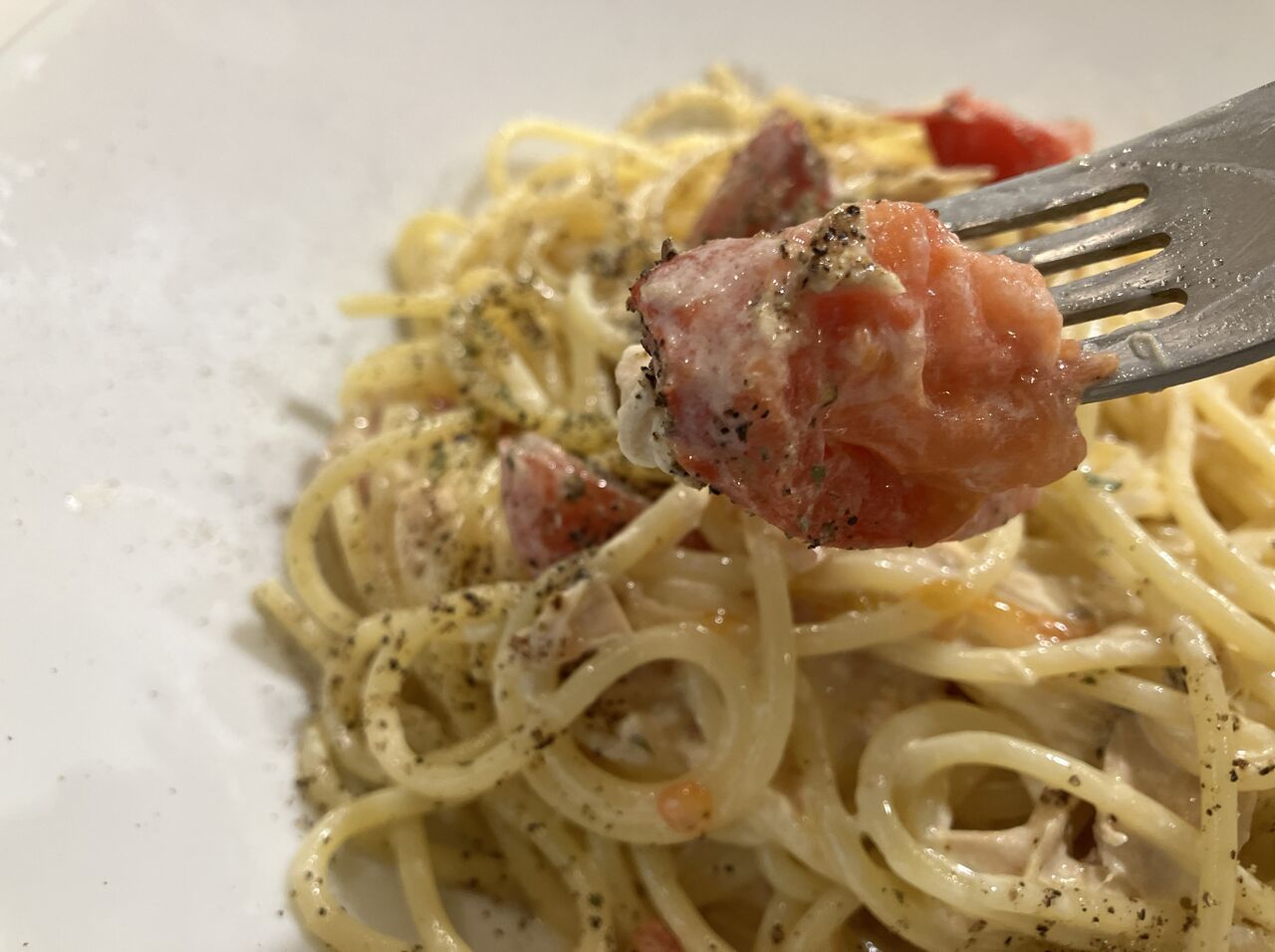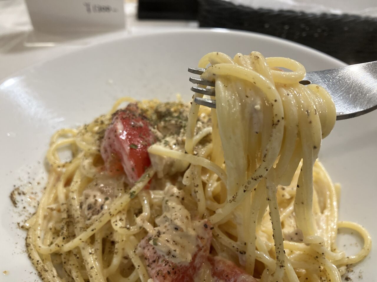 パスタは茹でたてで熱々、火傷注意。