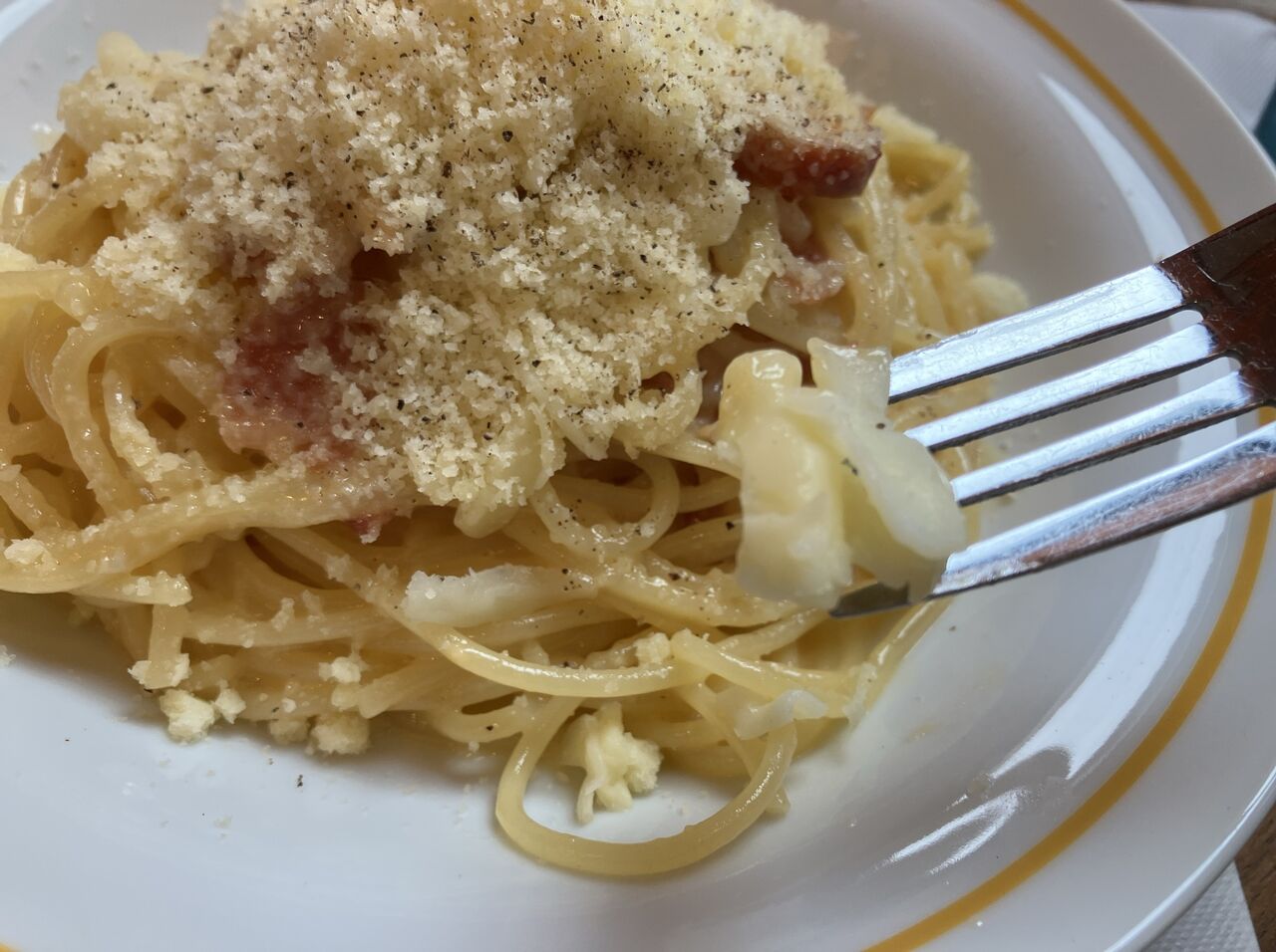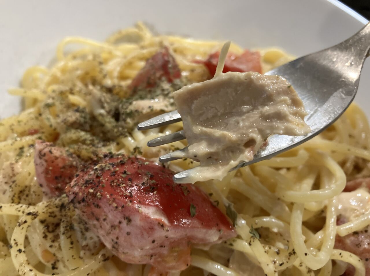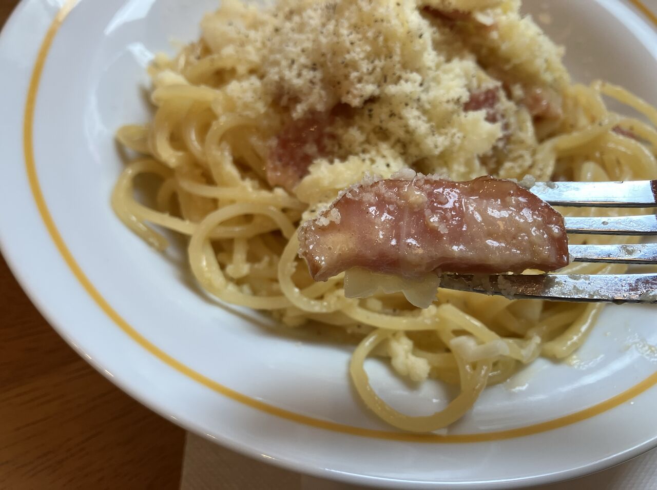 パスタは茹でたてで熱々、火傷注意。