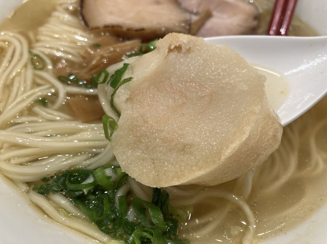 チャーシューは小ぶりながら、肉肉しくて美味しい。