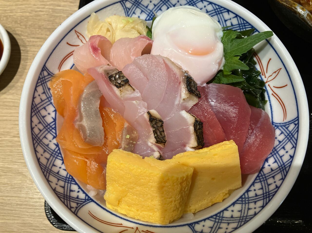 温玉がついてきたので、まずは海鮮丼に乗せる。