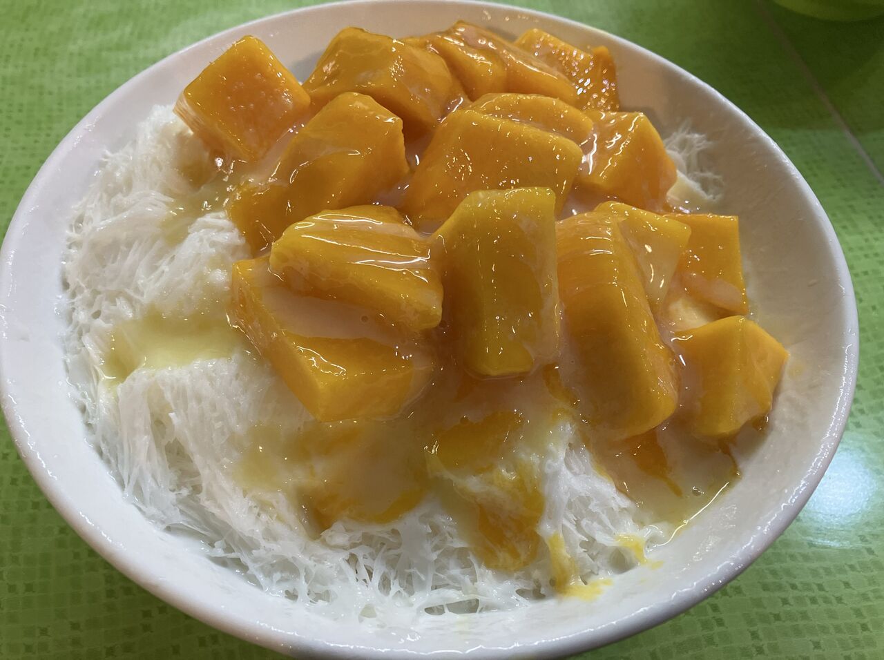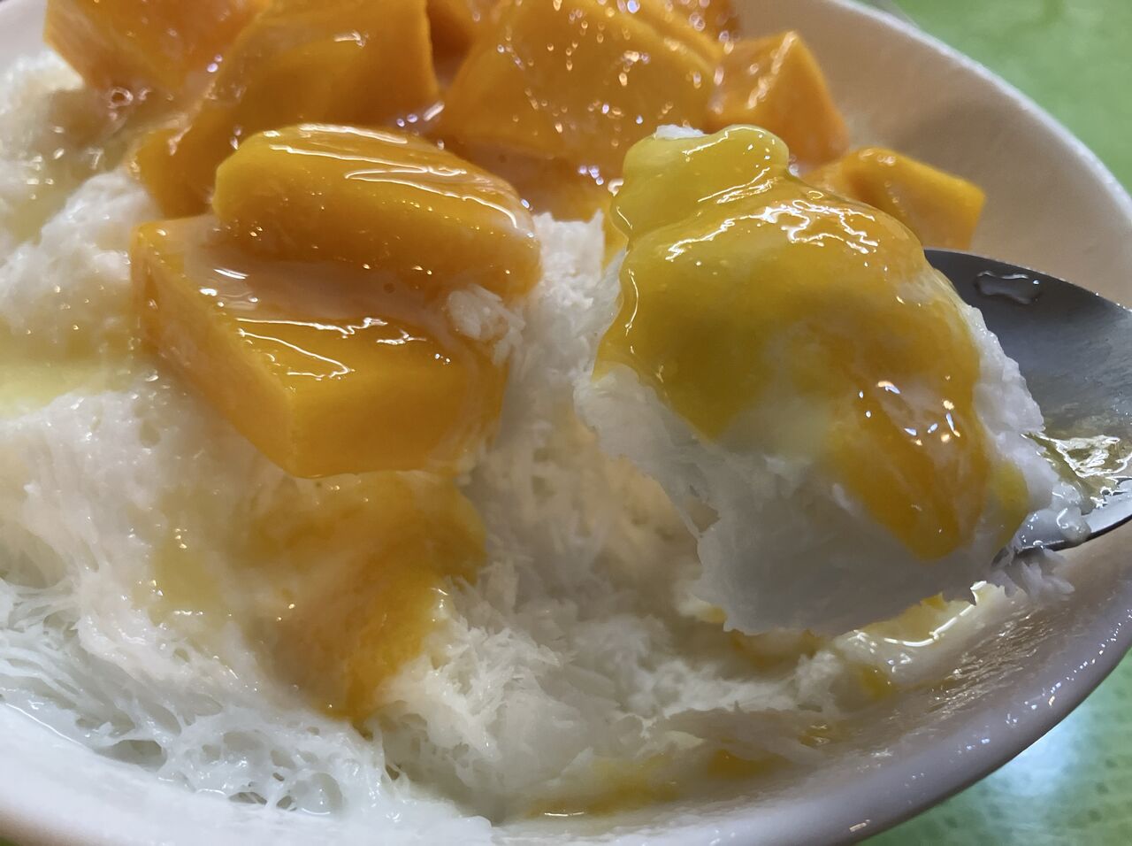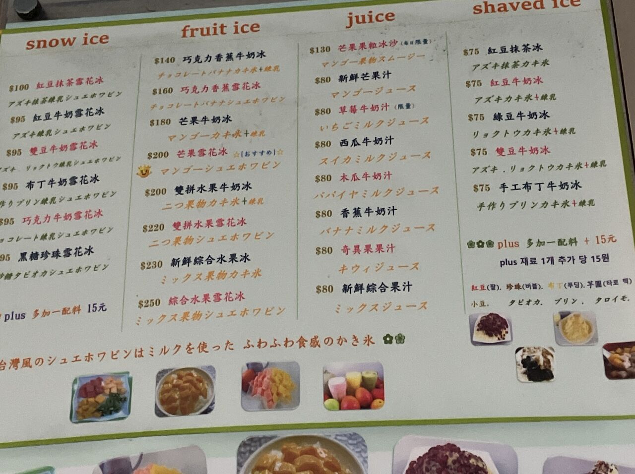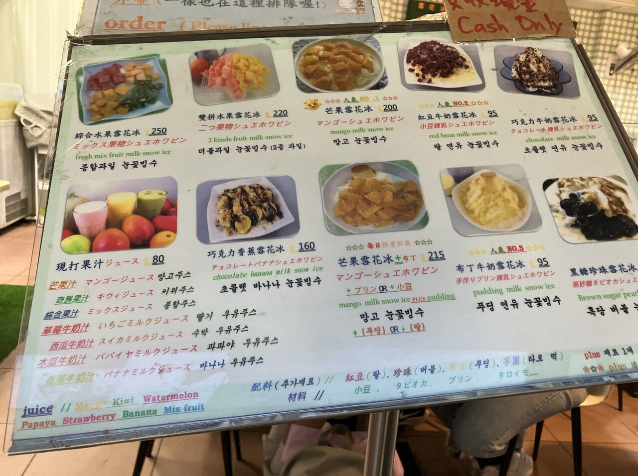 かき氷は刨冰(日本のかき氷と一緒、水を凍らせて削ったもの)と雪花冰(牛乳を凍らせて削ったもの)があるが、雪花冰に絶対にすべき。